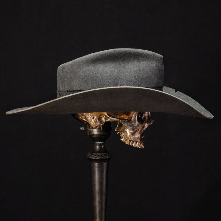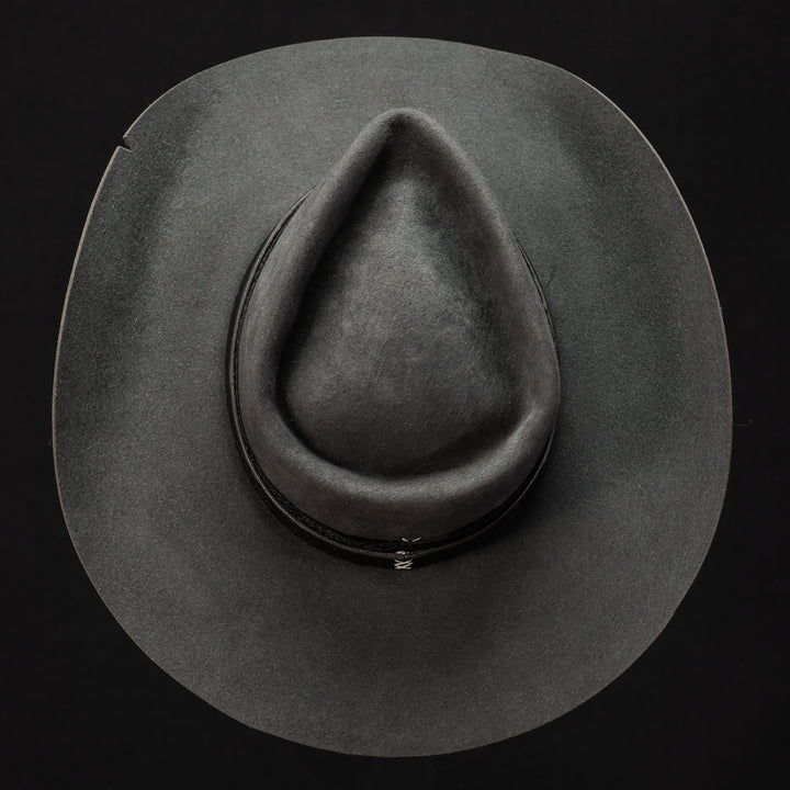This clean hat features a heavy western brim for a simple and serious look. Wrapped in custom embossed black leather and textured black fabric. This cool cowboy hat is always ready to hit the road or head into town.