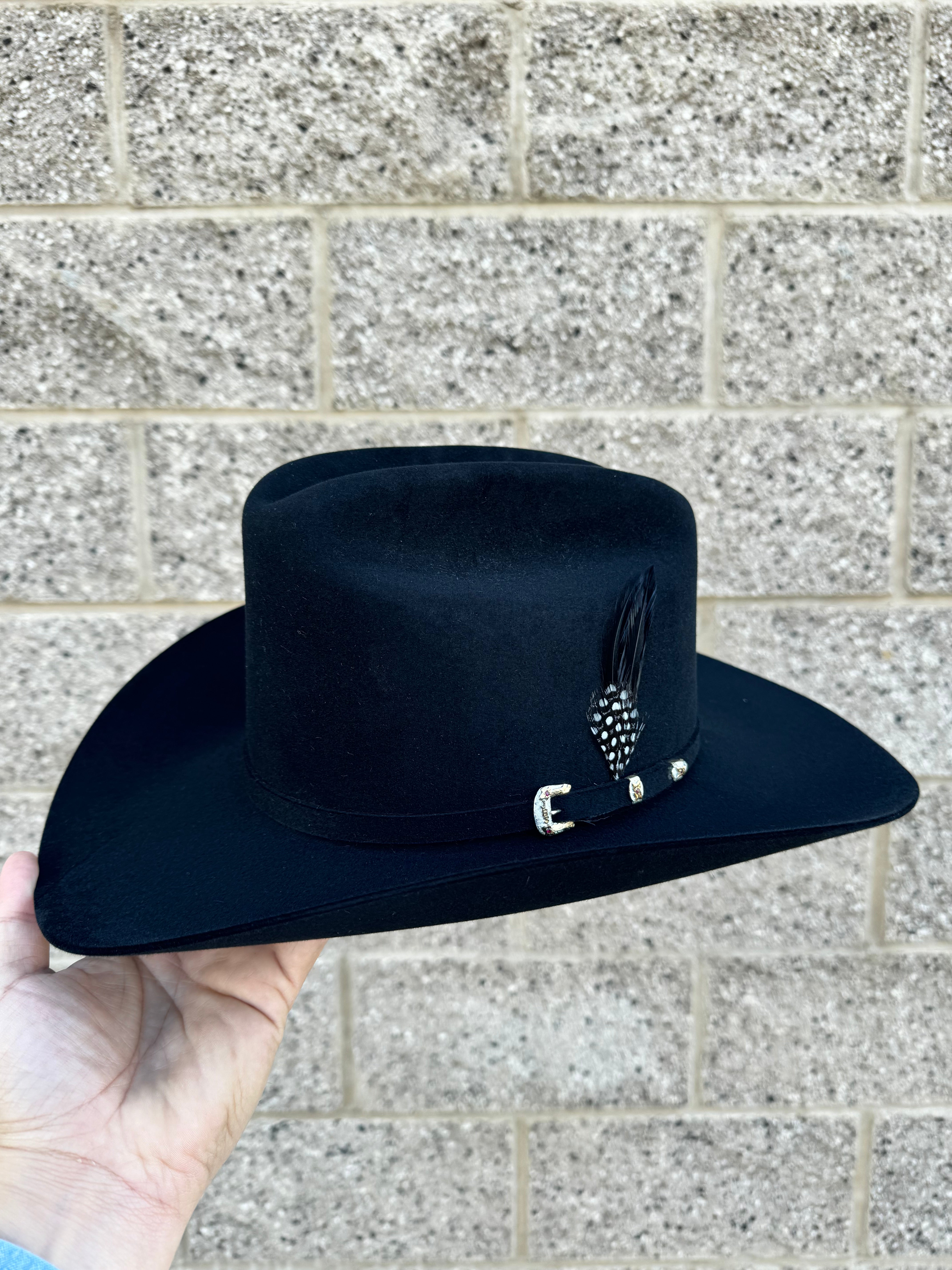 The El Patron 48 Premier 30X Cowboy Hat is constructed of 30X quality fur felt and features an oval cattleman crown and self-matching hat band accented with sterling silver JBS buckle set with gold overlays and inset stones. 30X Quality Fur Felt. Made in USA.