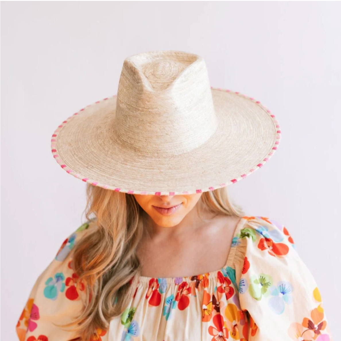 Pink whipstitching around brim of hat