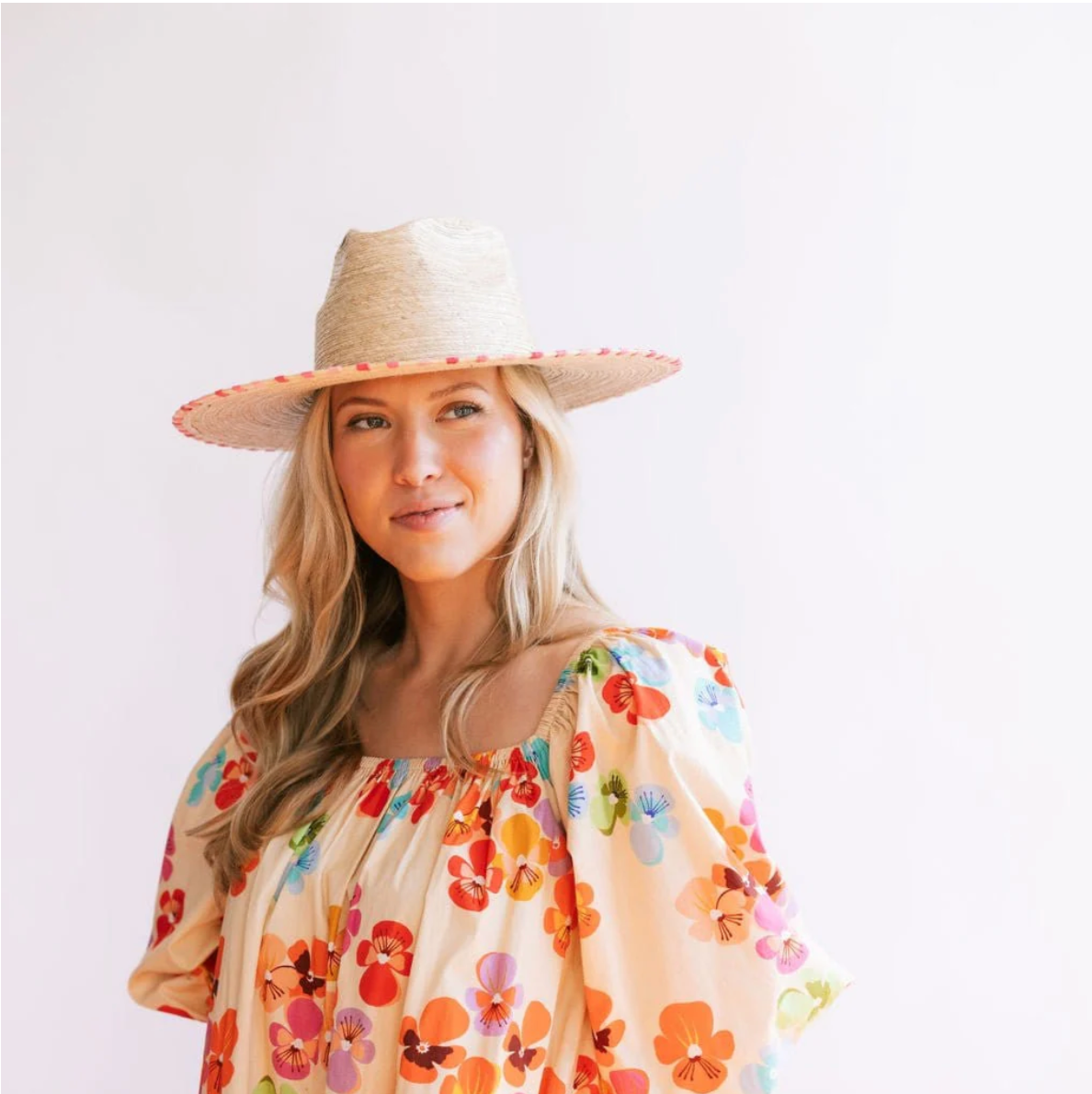 The Adelina Palm Hat comes without the band and features hand stitched pink stripes along the brim and is a part of Sunshine Tienda's sustainable, fair trade hat collection and rated UPF 50+, the highest possible UV protection.
