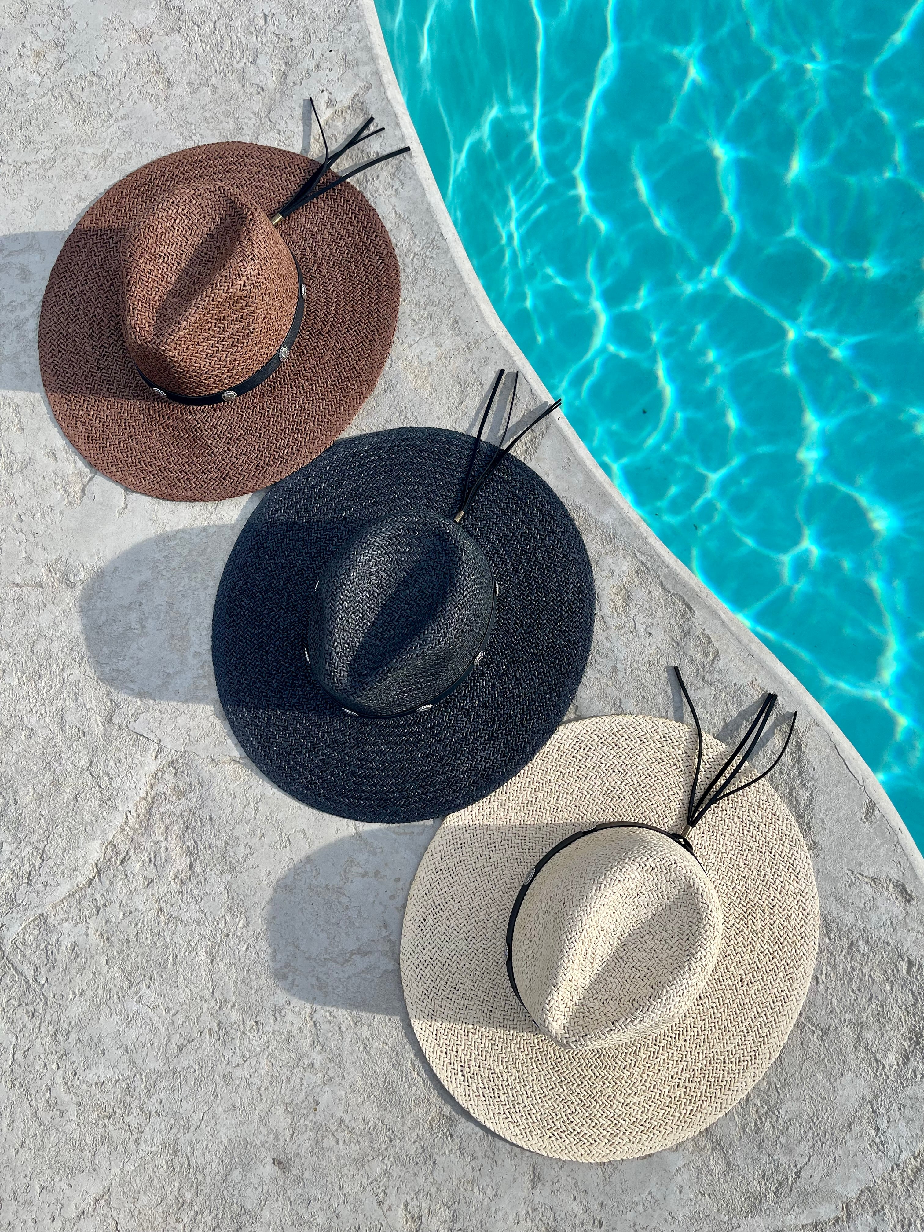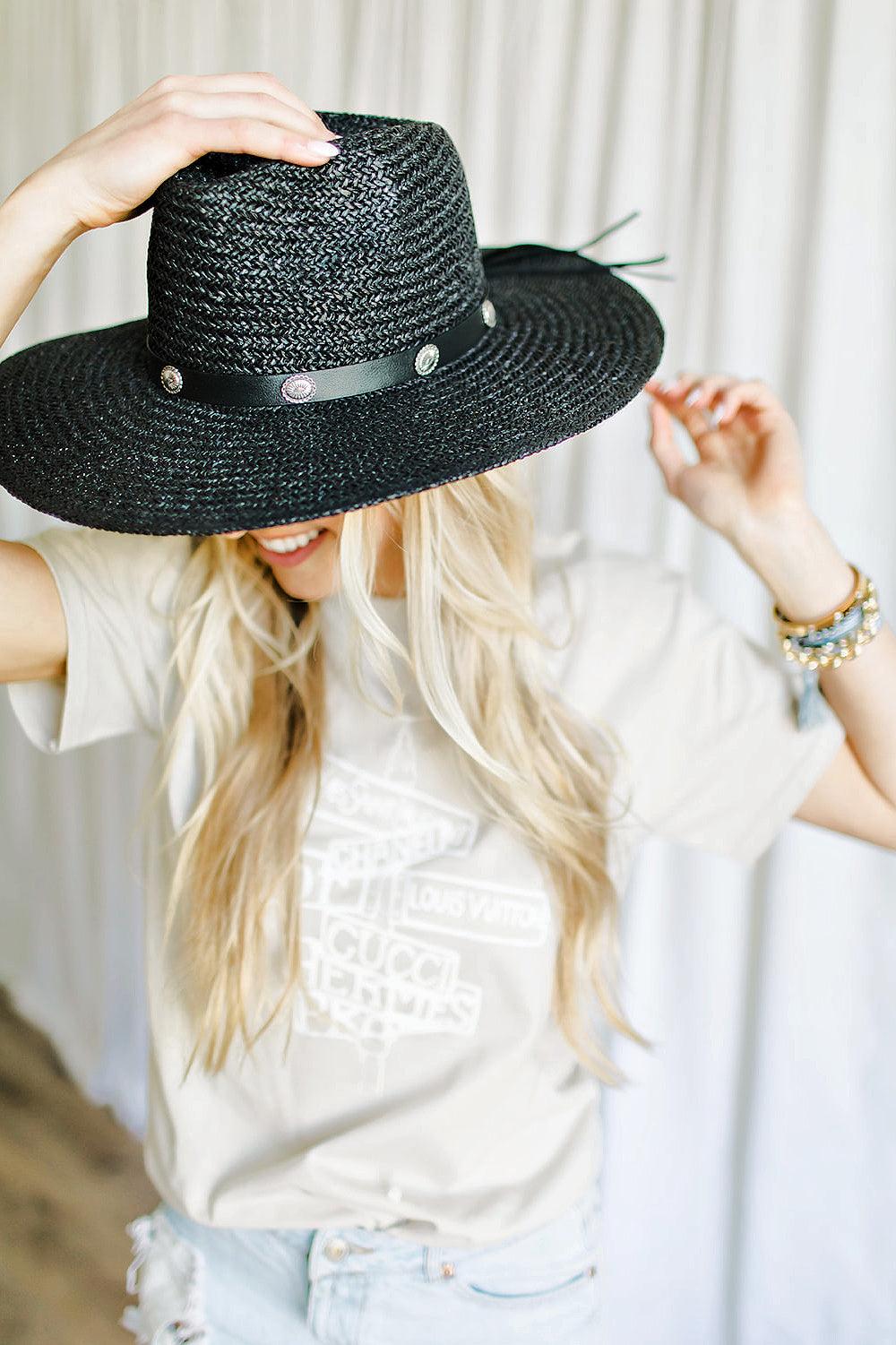 Our Bandera straw hat fits in perfectly with your spring and summer wardrobe, whether at the pool, beach or a concert! On trend w/ a western vibe, classic, chic - everything you've ever wanted in a hat. Featuring a molded crown with a pinched 10cm brim and hand woven straw, it's embellished with a faux leather and silver antique button trim. Finished off with a tassel at the back.