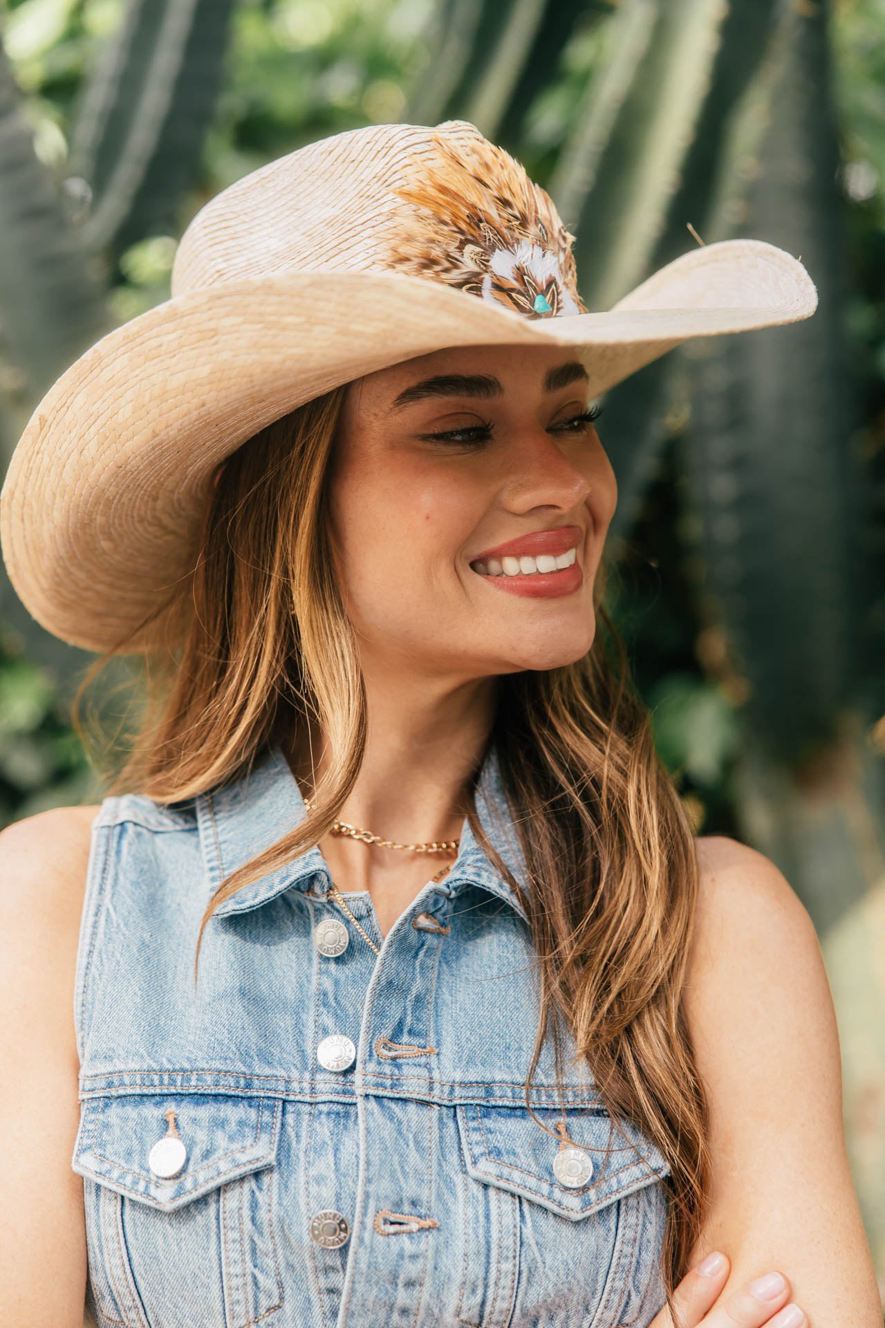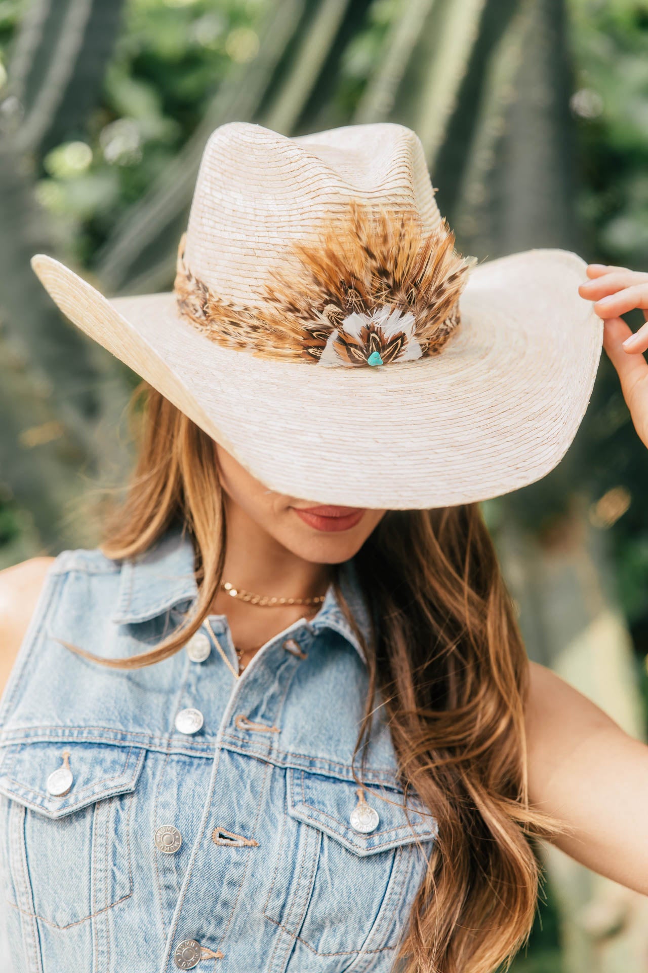The Wildest Dreams hat is made of 100% palm leaf that is sealed to protect its body from humid environments. This classic design will surely stand the test of time. Embellished with a REMOVEABLE handmade feather hatband.