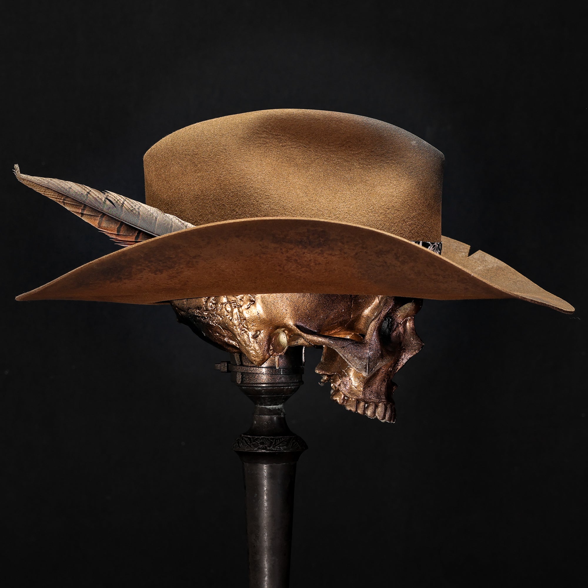 This Tennessee Teardrop European Hare in Whiskey has a sharp cowboy curl. Wrapped in black paisley fabric and an embossed black leather strap with silver buckle. Finished with a silver horseshoe and large feather detail.